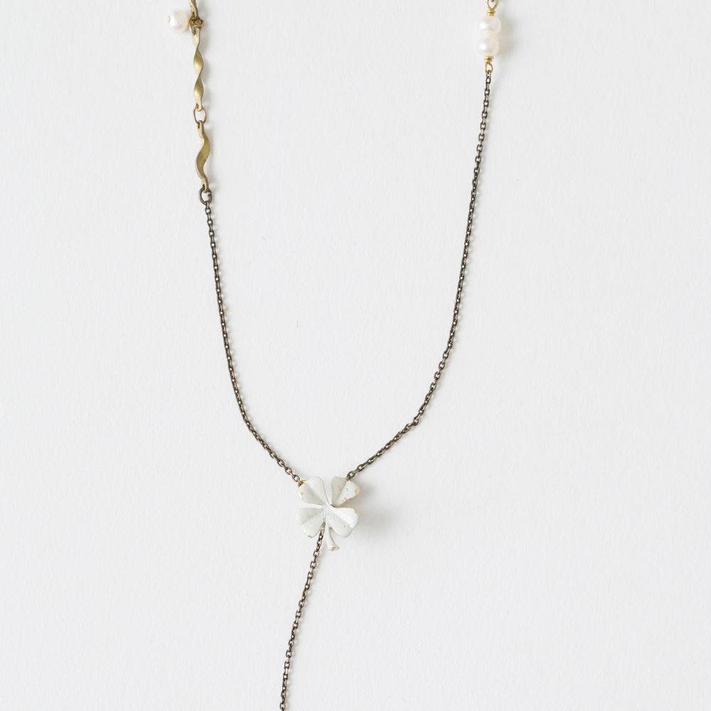 ロングタイプのネックレスは、ユニークな仕様になっています。三つ葉のクローバーと、少し離れた位置にひとつ葉をあしらったデザインで、ひとつ葉を三つ葉にスッと近づけると四つ葉になります。葉っぱをスライドすることで、細かく長さの調整が可能。ネックレス自体とても軽いので、重いのは苦手な方にもおすすめです。