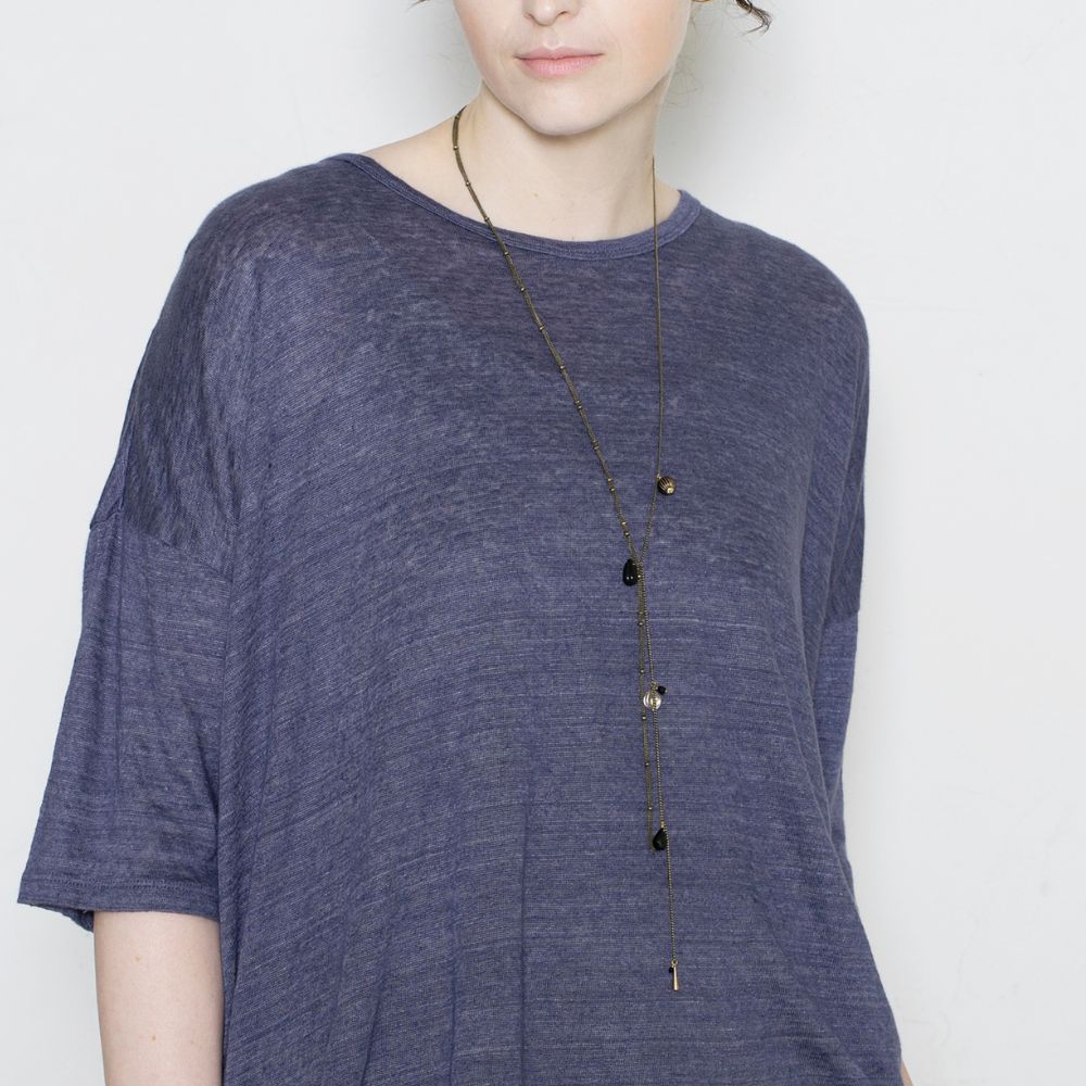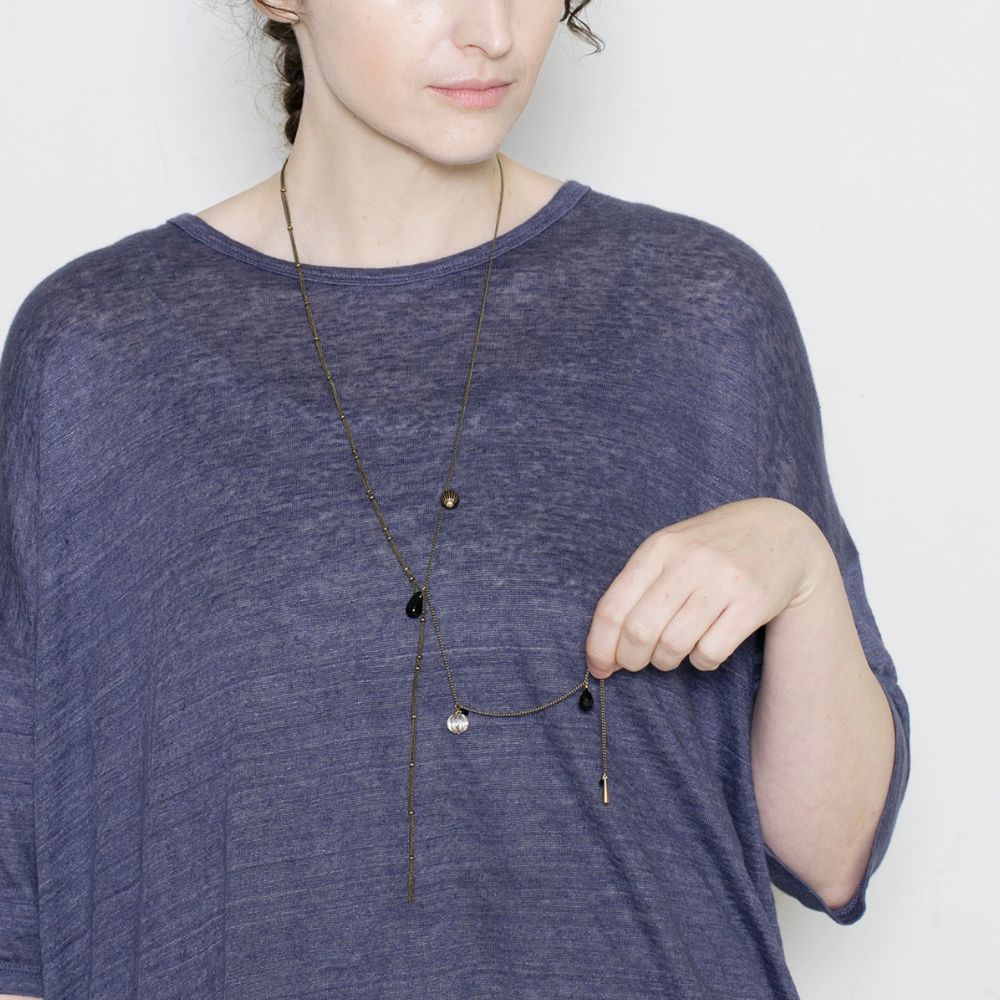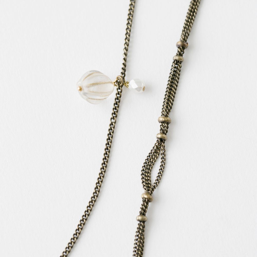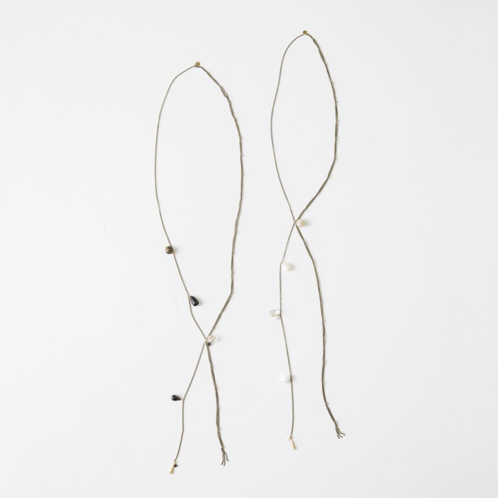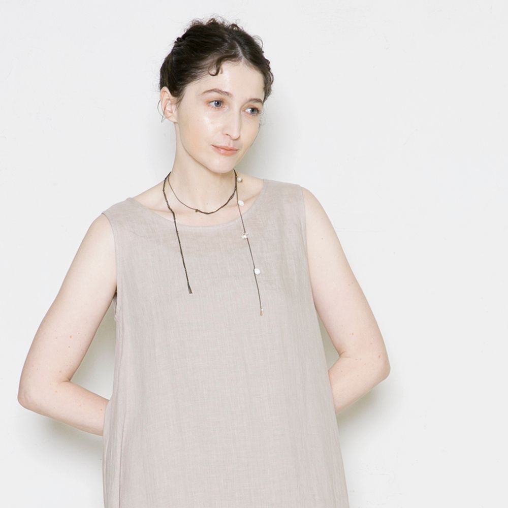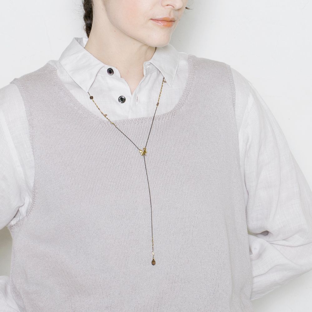 フラットなトップスにのせると、まるで洋服にボタンが現れたような、新しいアクセサリーの見え方に。汎用性の高いデザインなので、チェーンに通さずチェーンをくるっと引っ掛けてY字にしたり、ラリエットらしく首に巻いたり、様々なアレンジをお楽しみください。