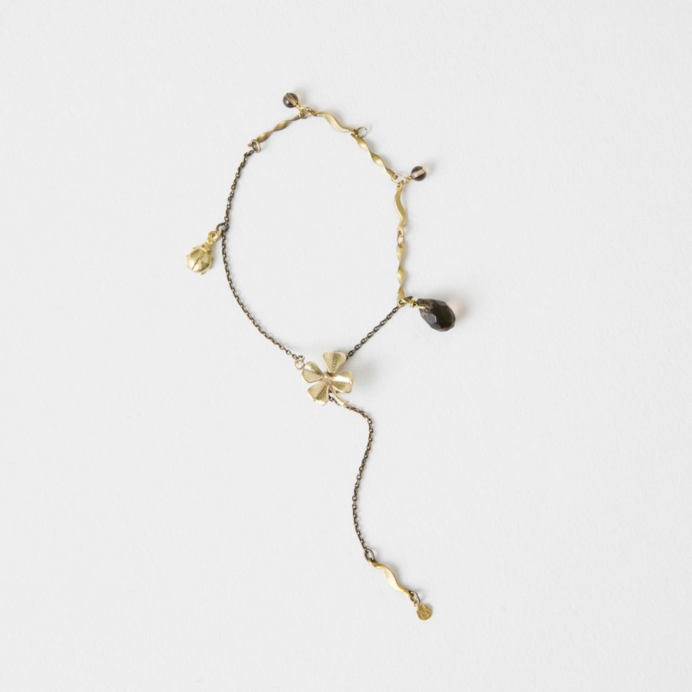 手元で目を惹くブレスレット。ネックレス同様にクローバーが主役で、ひとつ葉を三つ葉にスッと近づけると四つ葉になる仕様です。葉っぱをスライドさせてサイズを調整します。