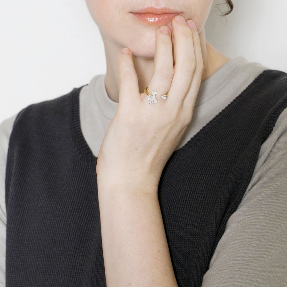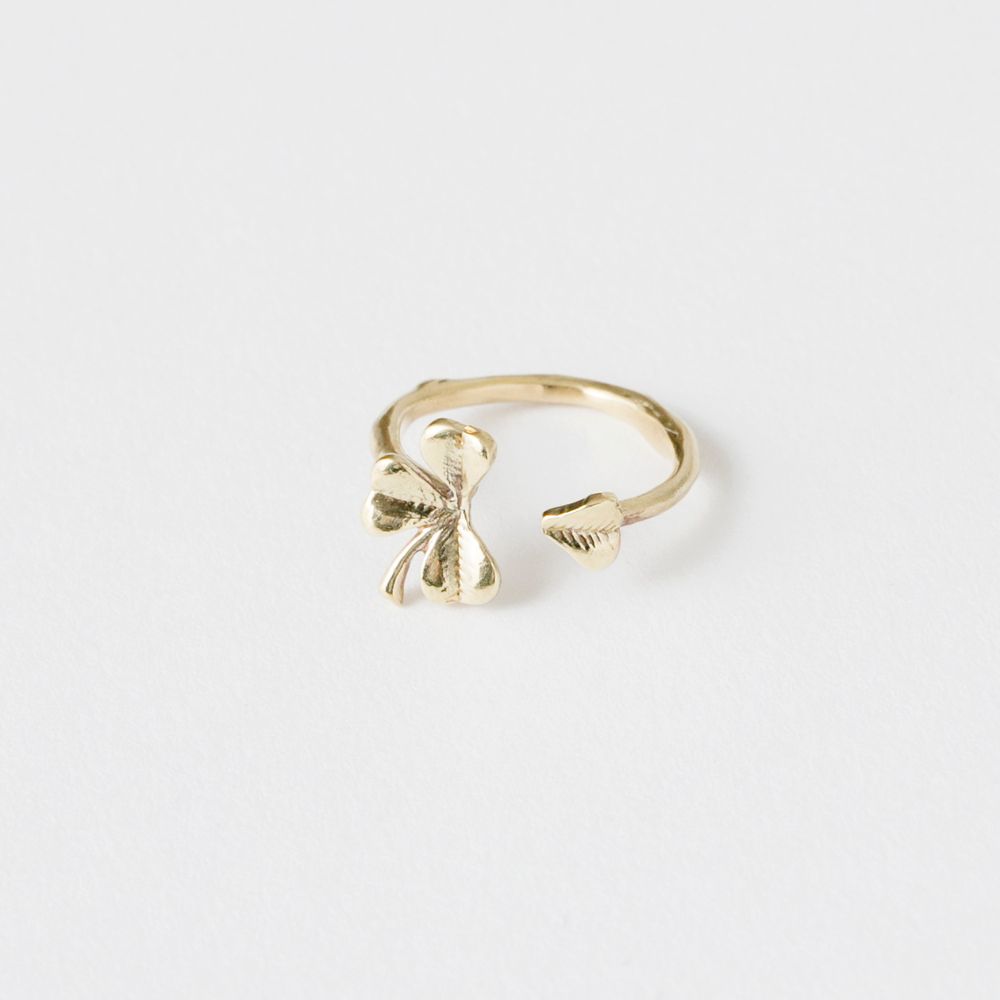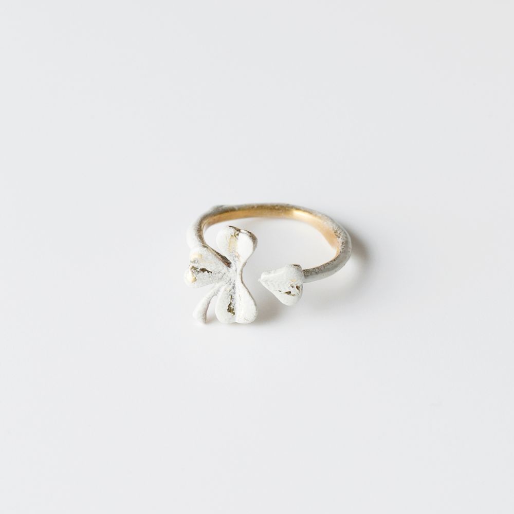 三つ葉とひとつ葉のフリーリング。リーフにホワイトコーティングを施した「ホワイト」と真鍮そのものの「ブラス」の2種類をご用意しました。
