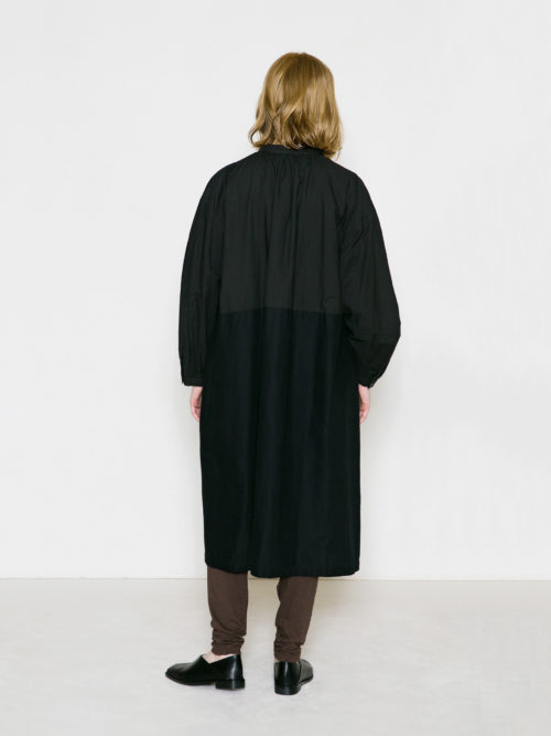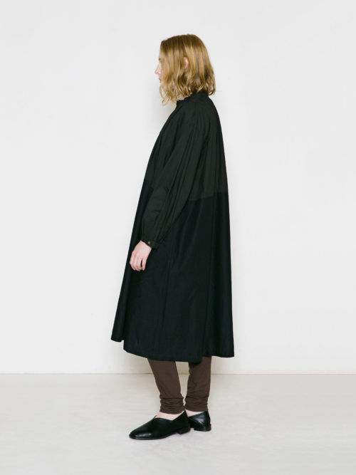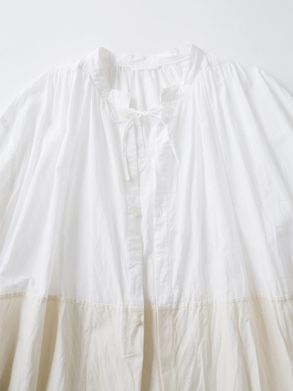 部分的に細やかなギャザーをあしらい、両サイドにはスラッシュポケットを配しました。