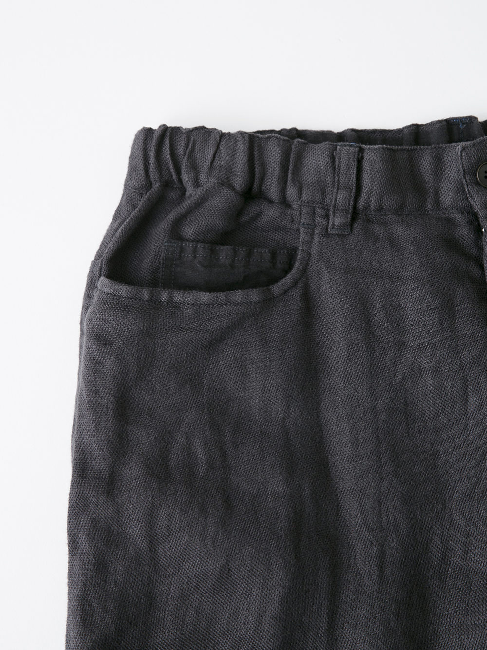 ウエストはサイドから後ろにかけてゴムを通し、前開きはファスナーで開閉する仕様です。