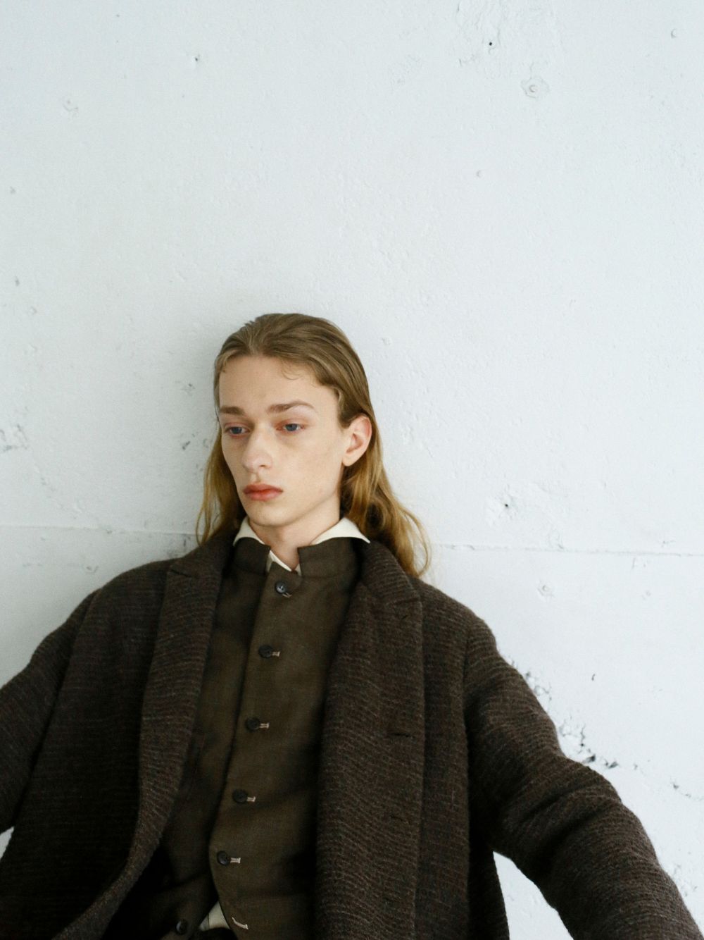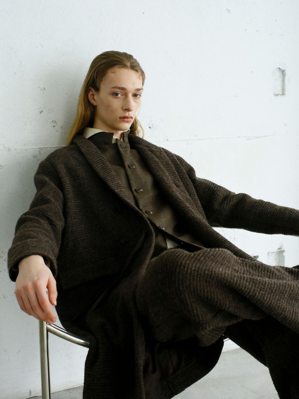 冬の必須アイテムのアウターは、リネン×ウールのオリジナルワッフル生地で仕立てた1枚をご用意。コルトレイクリネンとシェットランド諸島産の羊の原毛のみを贅沢に使用しました。あたたかみのあるツイードのような質感や、ワッフル組織の細かな凹凸などが特徴的で、どこか品を感じるコートです。