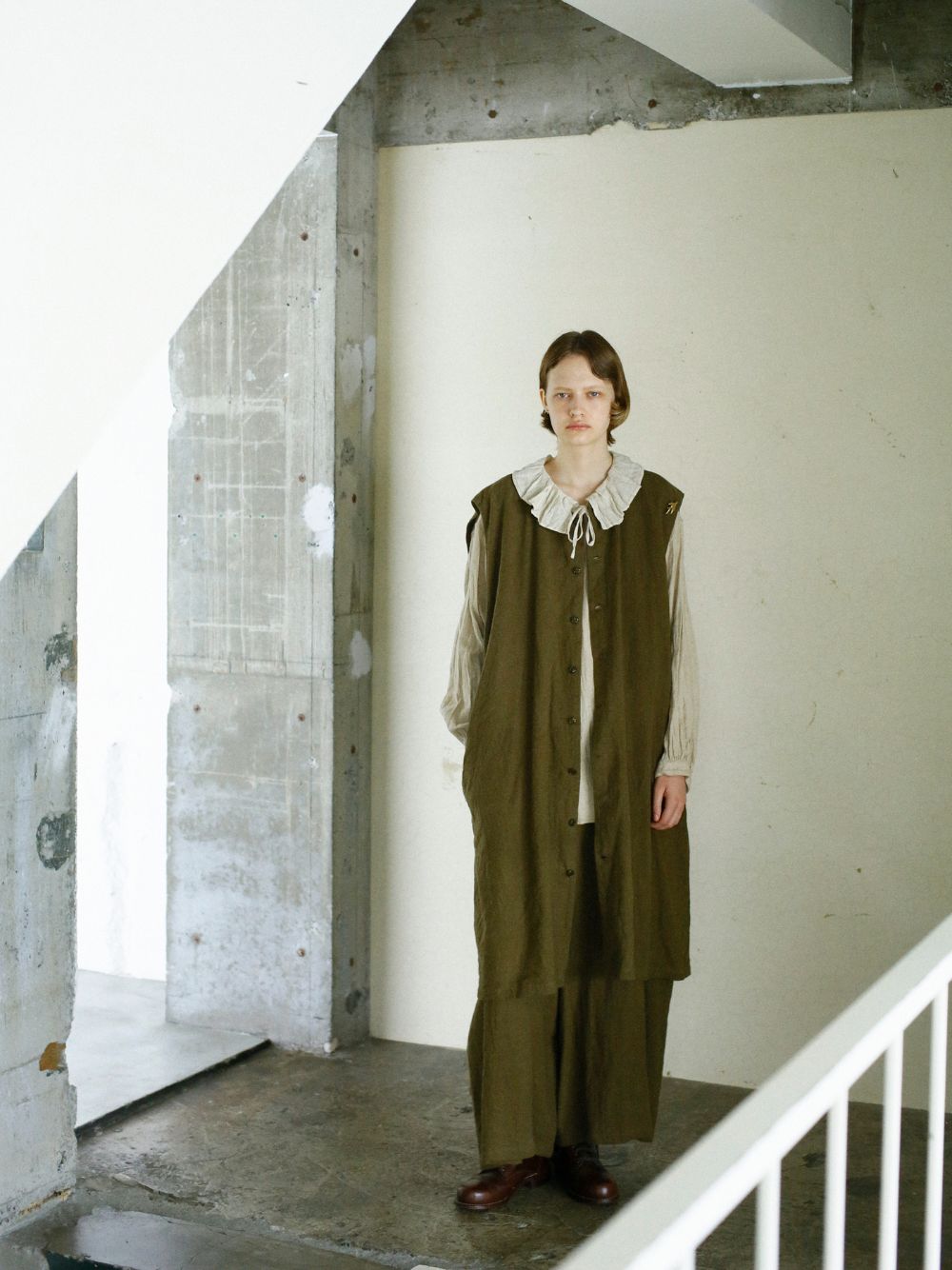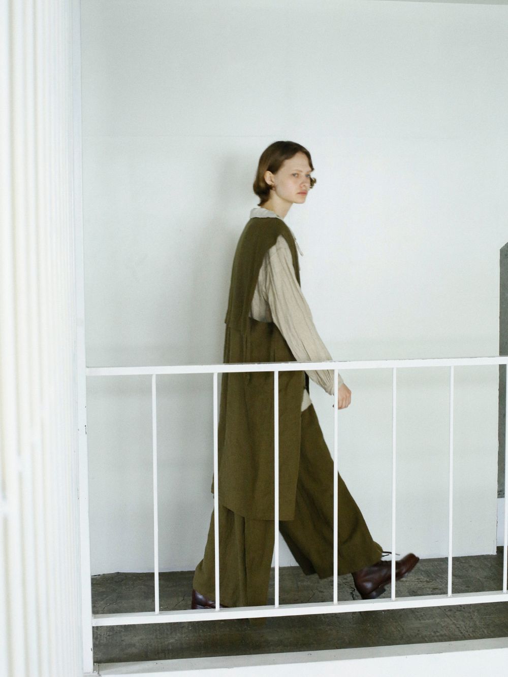 秋冬のレイヤードスタイルを楽しめるロングジレ。今シーズンは、リネン×ラミー×ウール素材『Washed Linen Ramie Wool』でお作りしました。ブラウスやニットなどと重ね着をぜひ楽しんでください。同シリーズのカーブパンツとコートのヴラスブラムらしいセットアップもおすすめです。