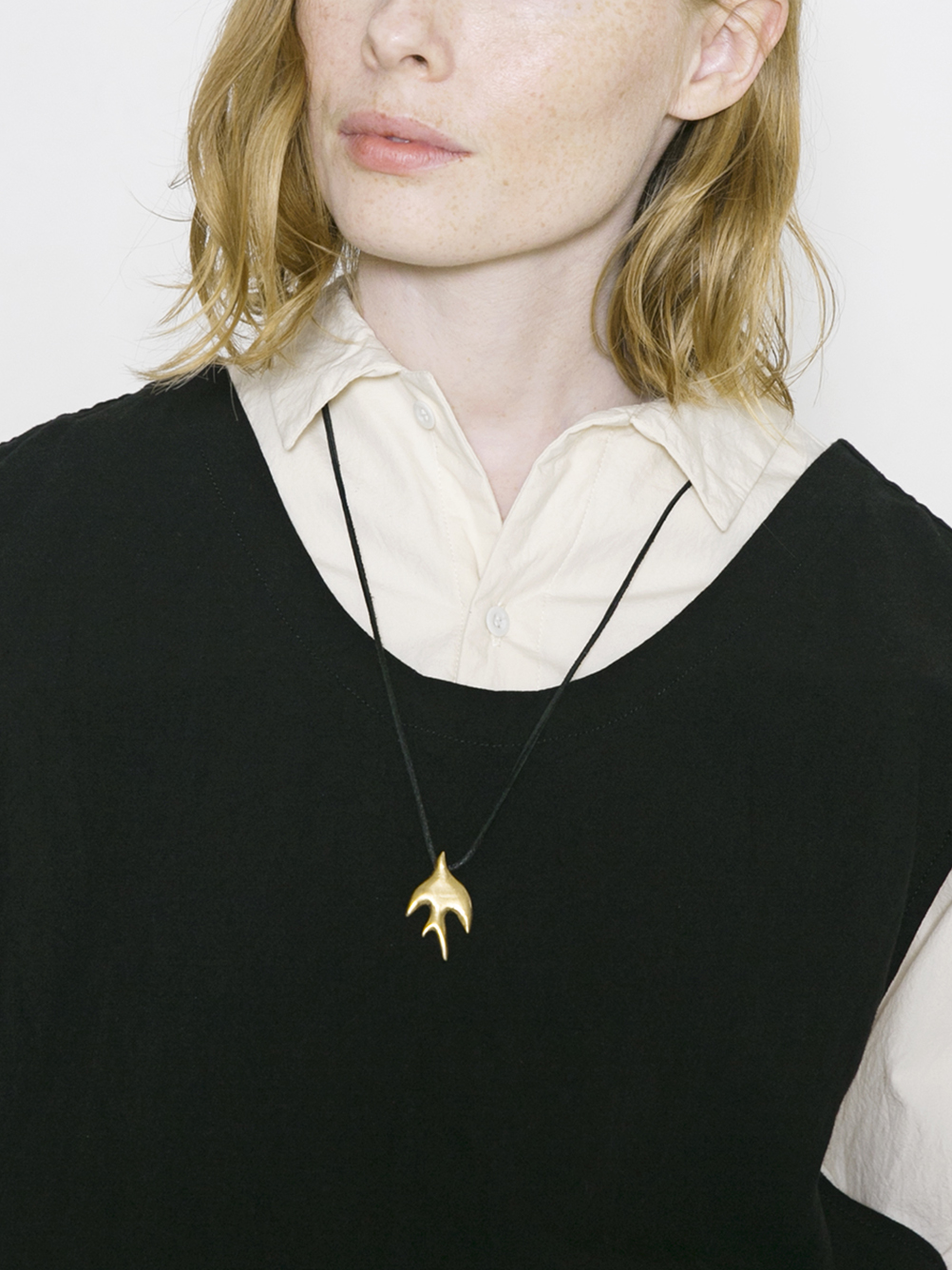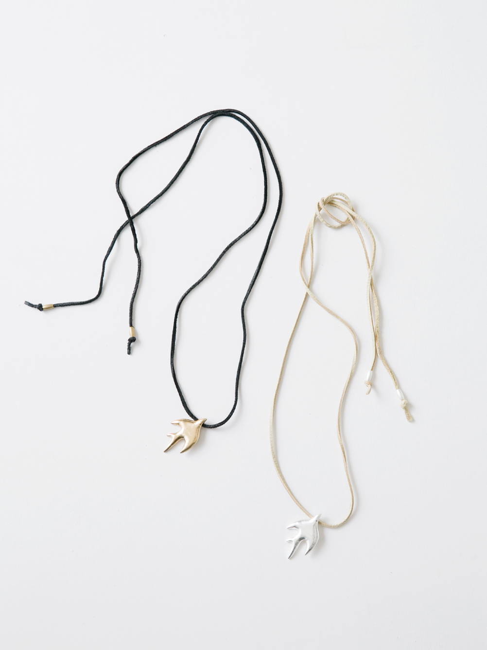 コードにツバメモチーフを通したシンプルなネックレス。レザーコードのため、金属アレルギーをお持ちの方でもつけやすくなっています。