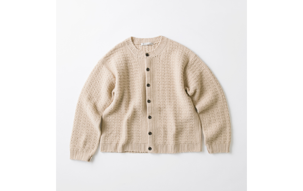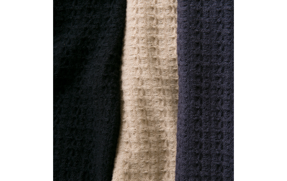 オーストラリアのタスマニア島で飼育されている、希少な純正ポルワース種の羊を原料に使用した『Tasmanian Wool』シリーズ。細く長い繊維のため、滑らかな風合いと弾力性が特徴です。あたたかみのあるワッフル柄で、スタイリングに奥行きのある表情をプラスしてくれます。