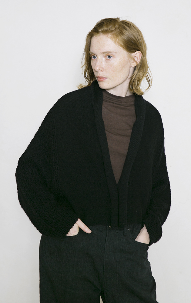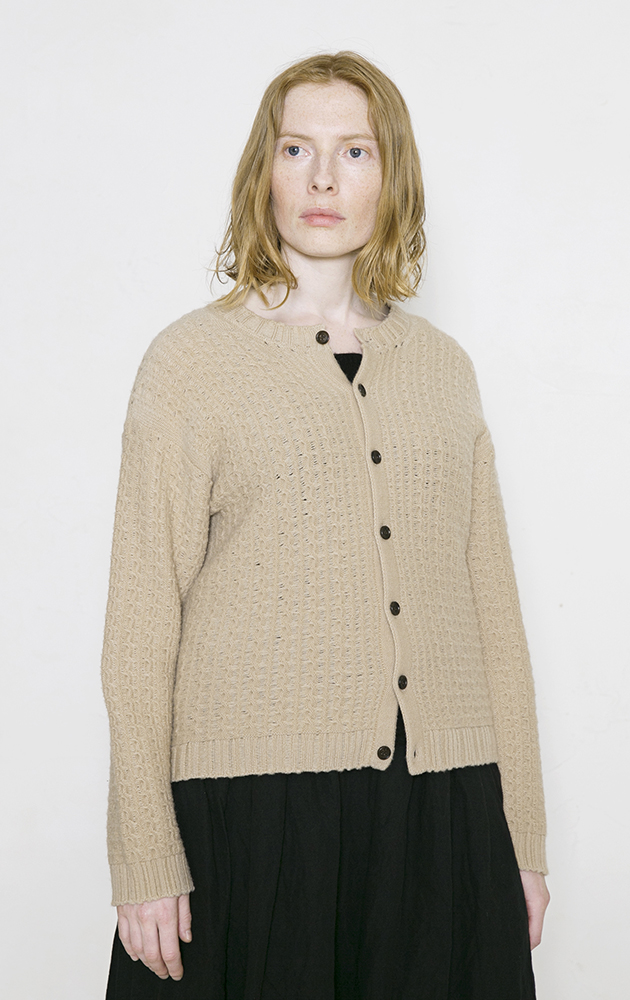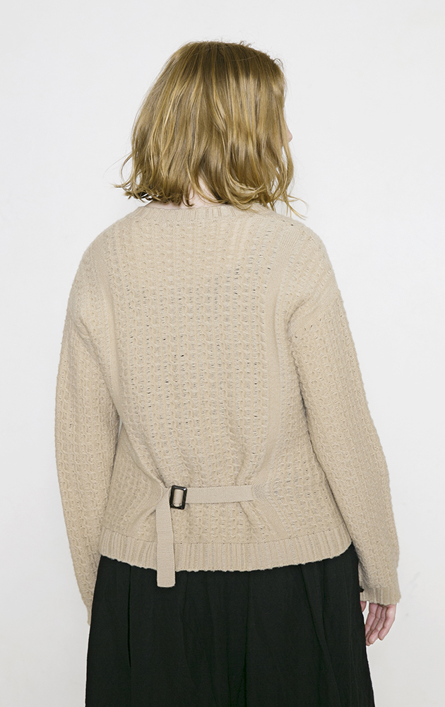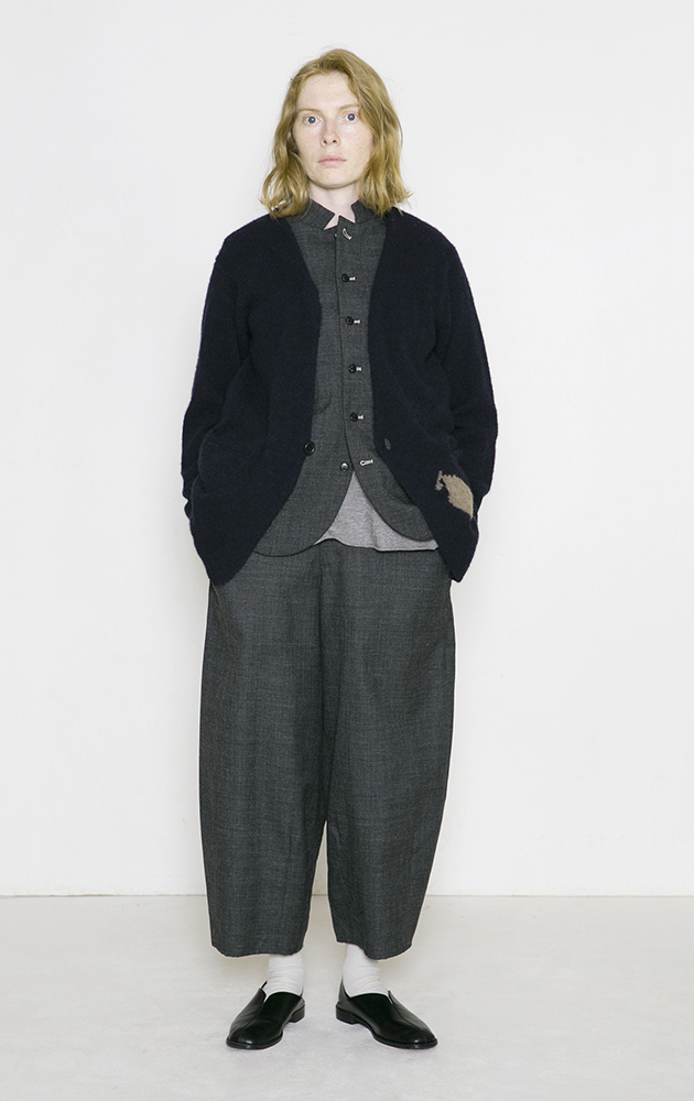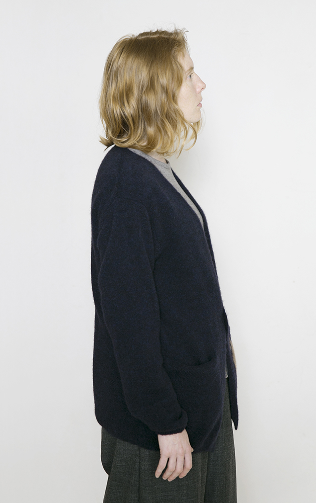 袖口の釦やバックベルトを配した、ジャケット仕様のカーディガン。ほどよいきちんと感とあたたかさを兼備した、頼もしい1着です。秋口はTシャツにさらっと羽織ったり、冬はシャツやハイネックのインナーと合わせて衿元のレイヤードを楽しんでいただけます。