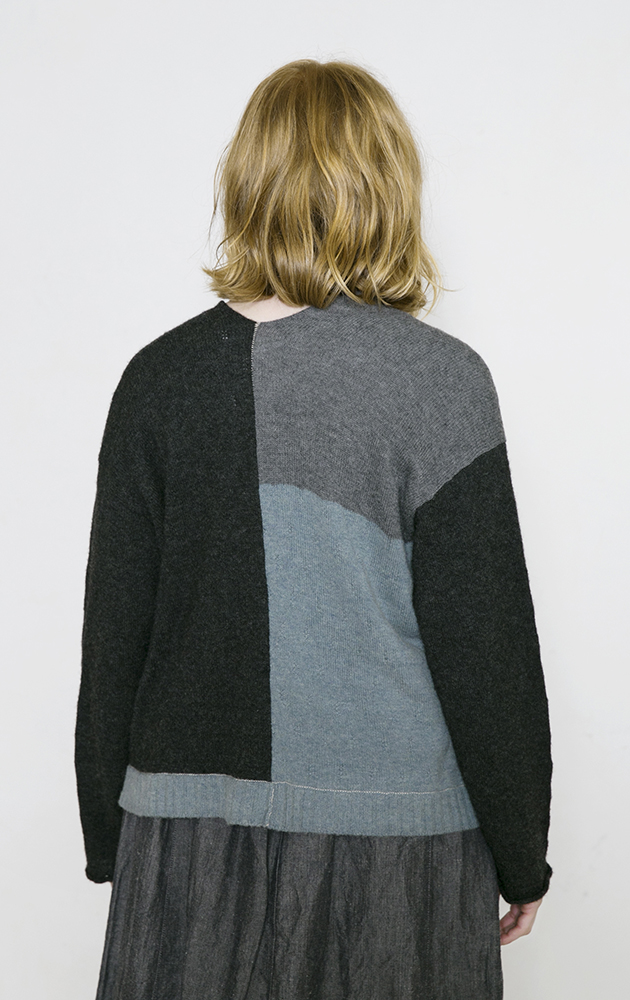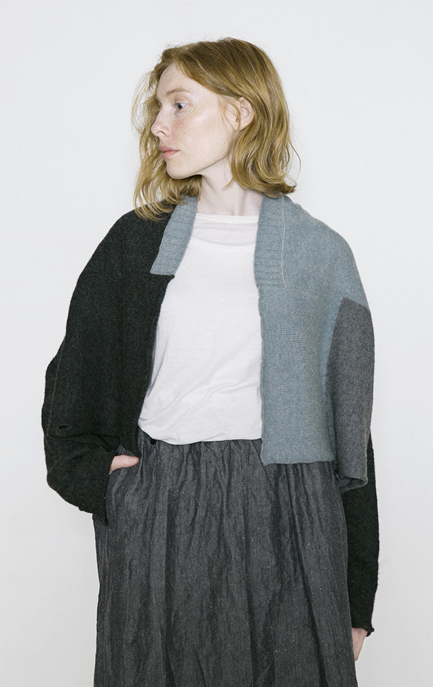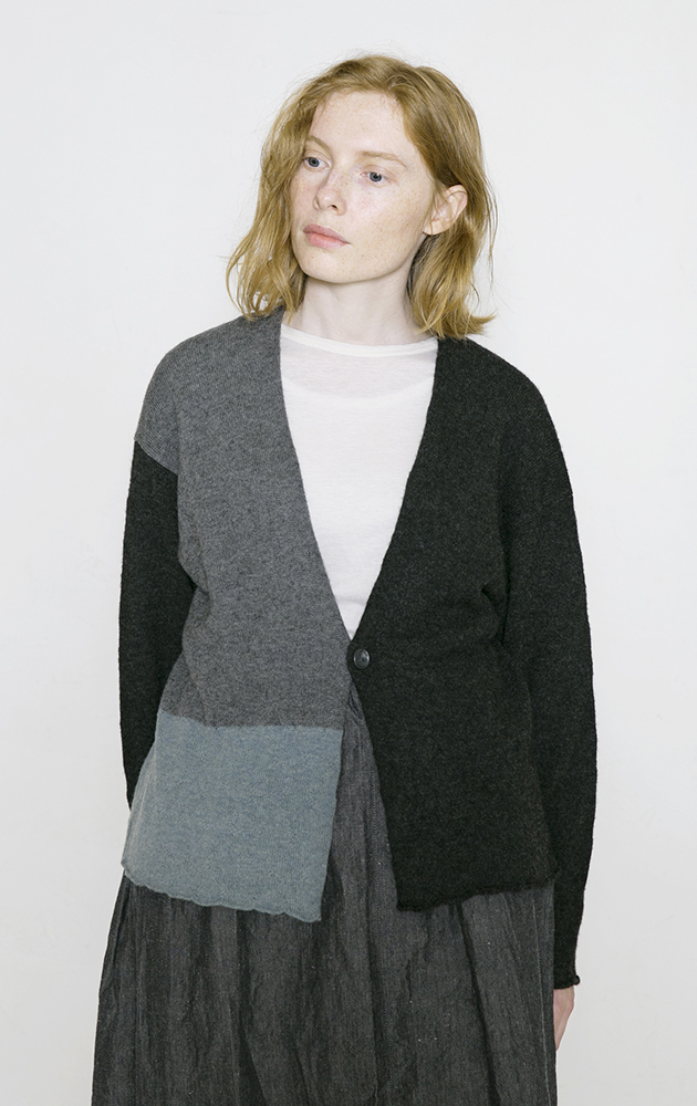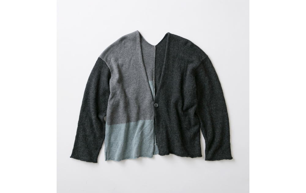 配色使いが他にはない魅力を放つVネックカーディガン。一部透かし編みになったデザインも拘りの1つです。こちらのカーディガンも上下逆さでの着用ができ、シルエットや配色の位置も変化するので、1枚で異なる印象の着こなしが叶います。