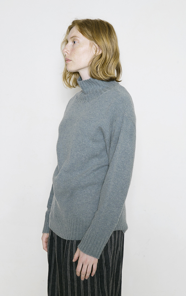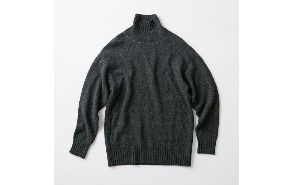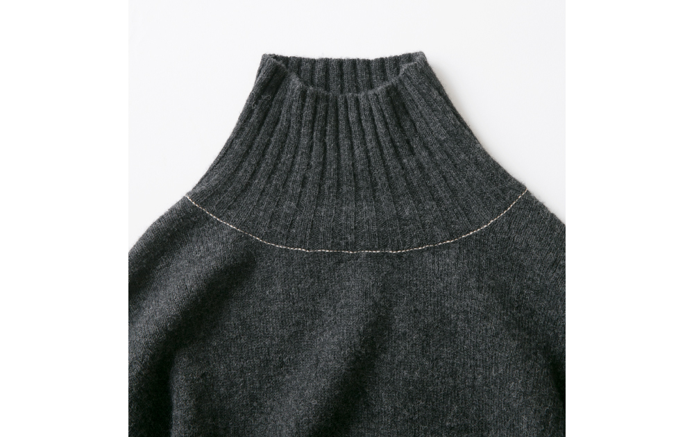 シンプルなデザインのハイネックニットは、ほどよいゆとり感でメインにもサロペットやジャンパースカートのインナーにも使いやすい1枚。ネック部分は配色のステッチがアクセントに。素材の良さが引き立つプレーンなアイテムなので、流行り廃りなく長く愛用いただけます。