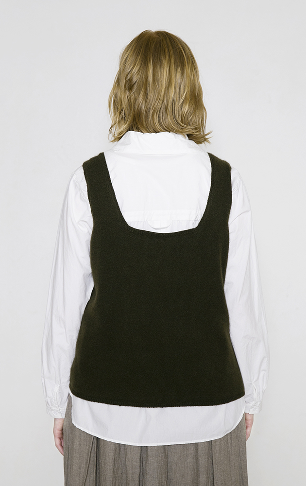 前後2Wayで着用可能なニットベスト。シャツやカットソーにプラスワンするだけで、グッと季節感を高めてくれるアイテムです。前後でネックの開き具合が異なるので、インナーやアクセサリー次第でお好みのバランスをチョイスいただけます。