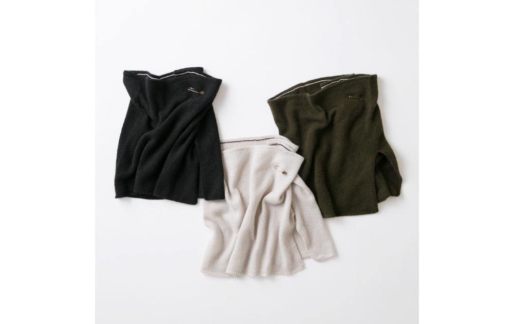 寒さ対策に欠かせない首まわりの小物アイテム。こちらのスヌードはコンパクトなので持ち運びにも便利な1枚。付属のピンでバランスを調整でき、首元だけでなく、腰まわりに巻いていただくことも可能です。スリットを配しているので、単なる腹巻ではなくファッションとして取り入れていただけるのがポイントです。