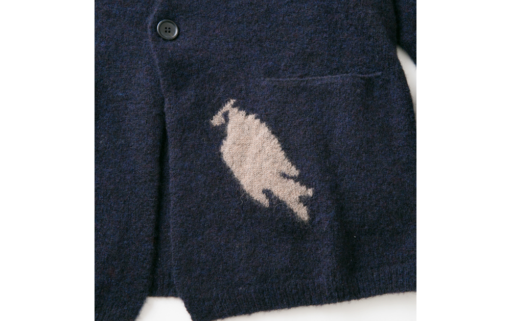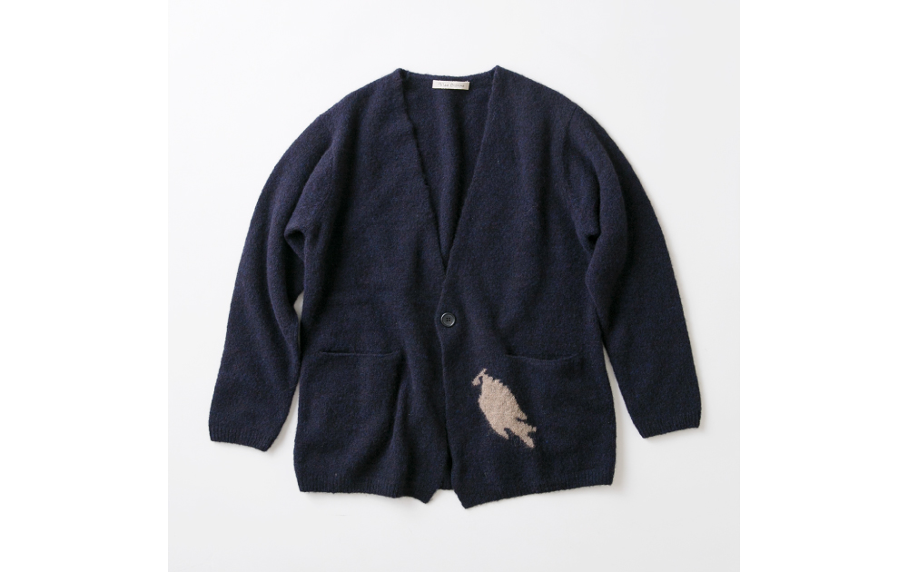 ジャガード編みで表現された「Swallow」がポイントのカーディガン。Vネックのシンプルなデザインに、さりげなくキャッチーさがプラスされています。ワンボタンでジャケットのようにサッと羽織れる手軽な1枚です。