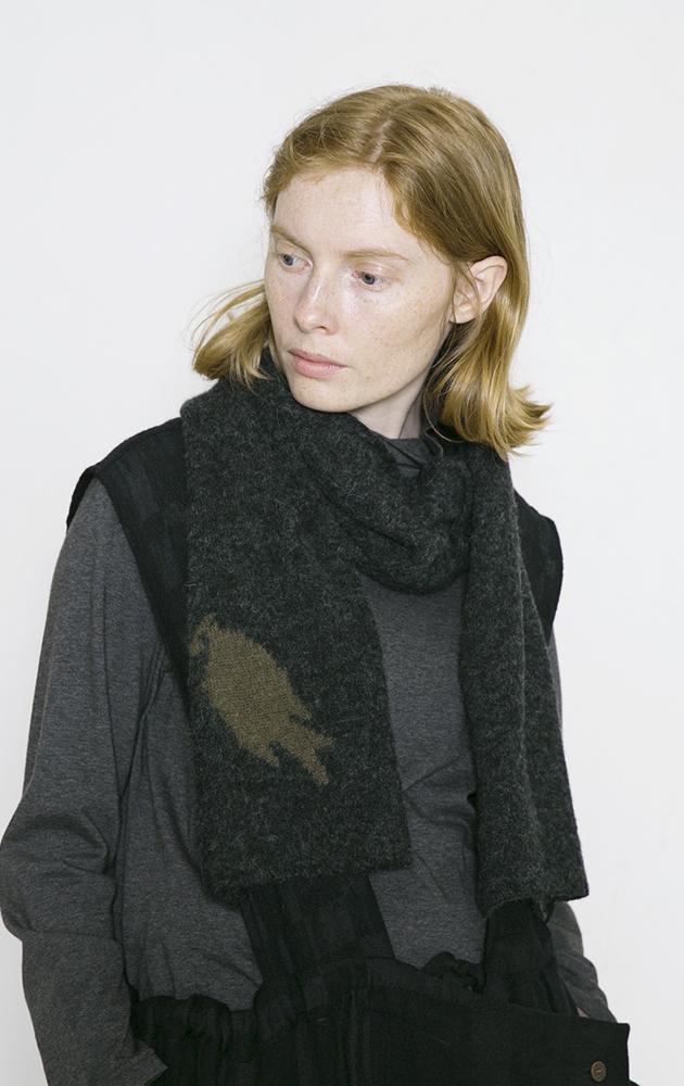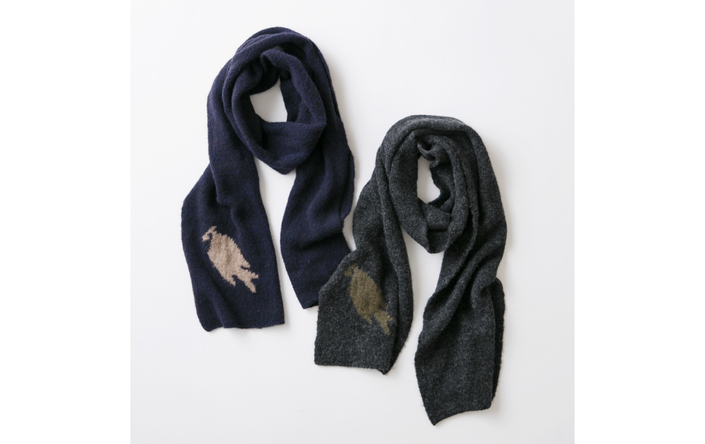 同じく「Swallow」柄が入ったマフラーも展開。スタイリングに馴染む落ち着いたトーンで、大人の遊び心をくすぐるプラスワンアイテムになっています。秋冬定番のチェック柄に飽きてしまった、という方にもおすすめの1点です。
