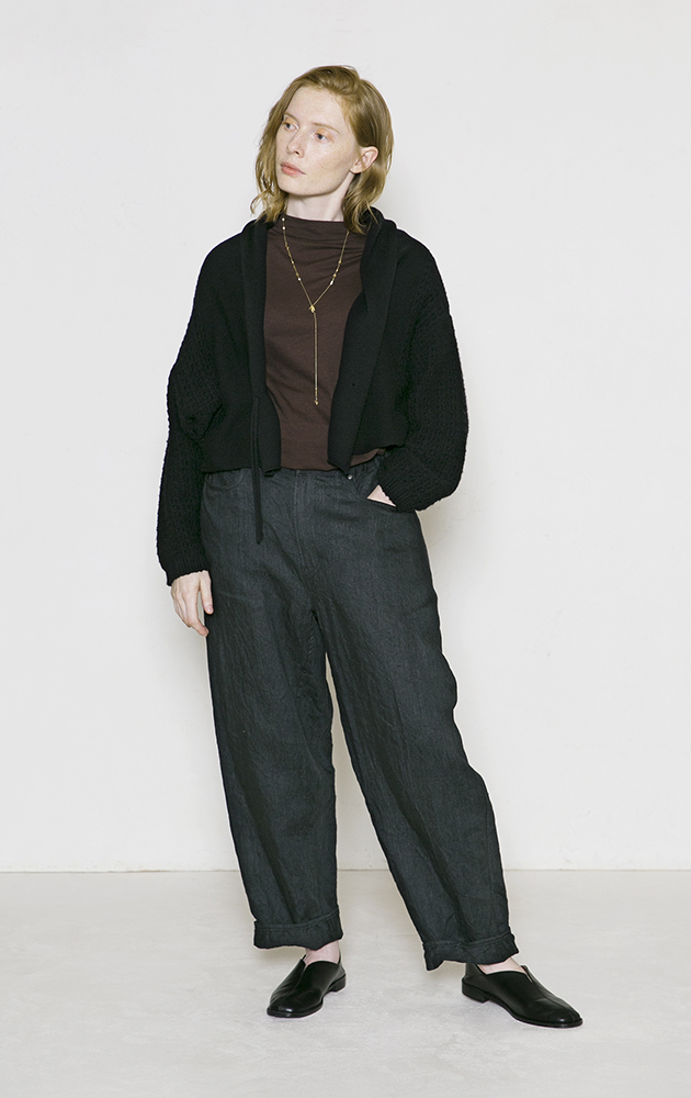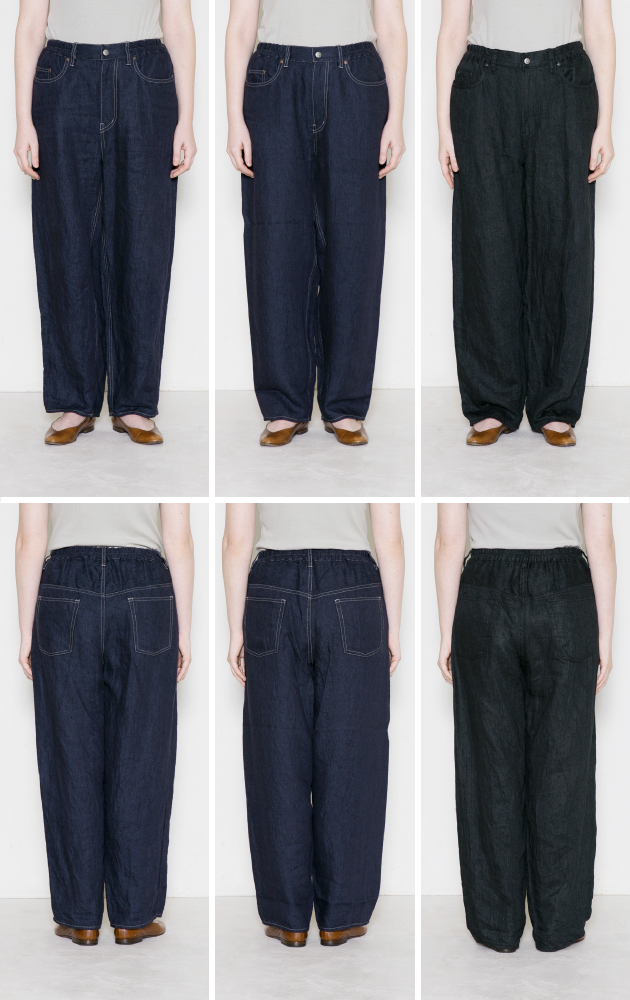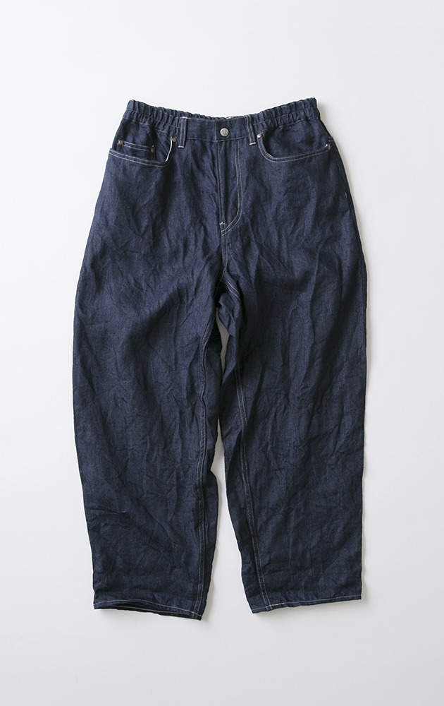 同じくコルトレイクリネン100%のデニムパンツは、腰まわりはほどよくワイドに、裾にかけてテーパードを効かせることで、トップスを選ばない汎用性の高い1本に仕立てています。こちらはベルトループも附属しているので、普段より1サイズ大きめを選んで、ベルトできゅっと絞ってみたり、ジャストサイズで裾をロールアップしてみたりと、自分好みのサイズをお選びいただけます。
