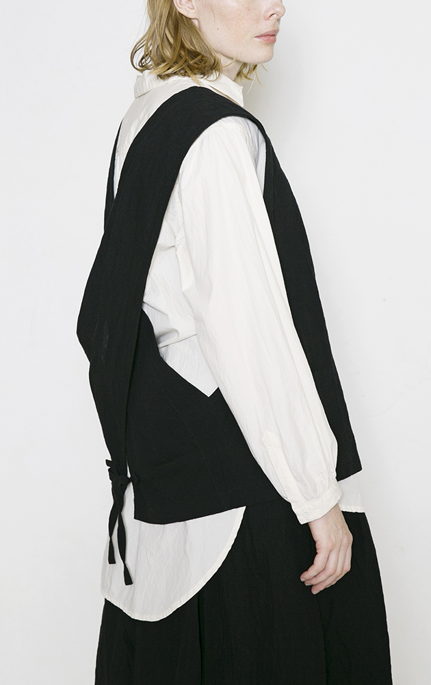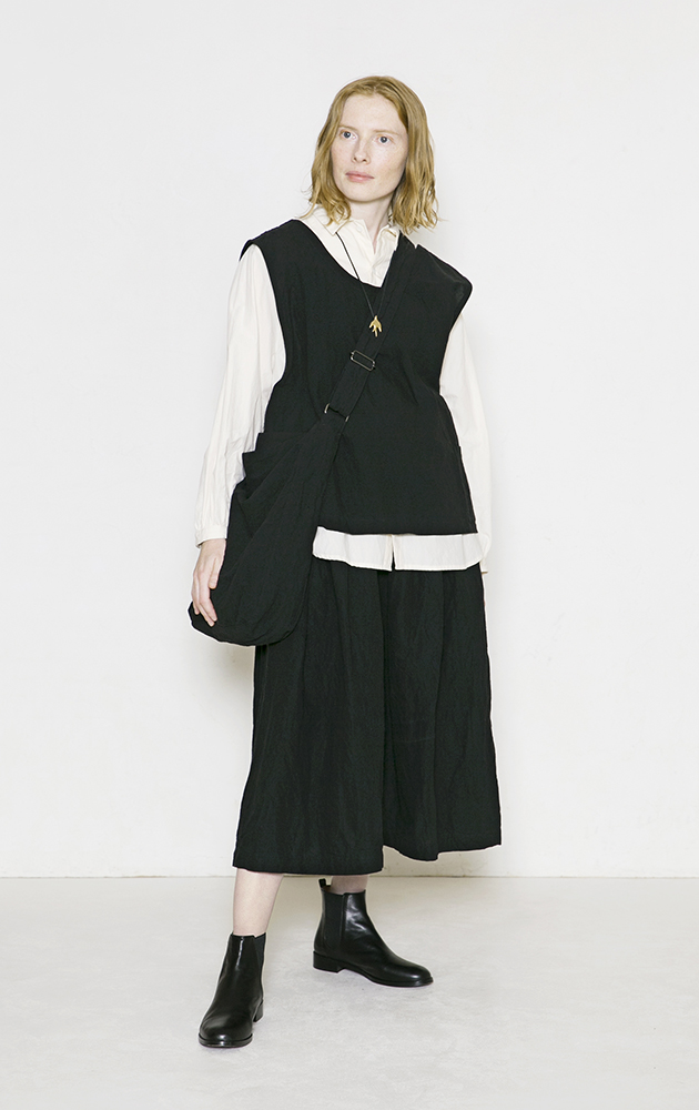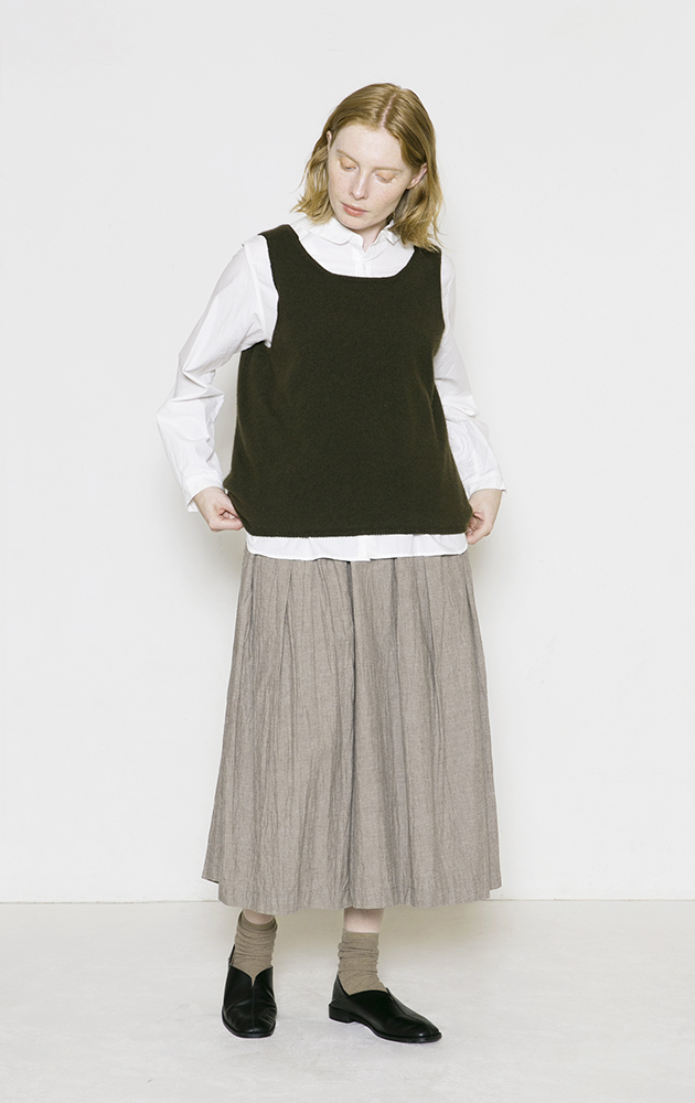 1枚でもサマになるアイテムですが、裾のデザインが引き立つよう、ジレやカーディガンとのレイヤードも相性抜群です。