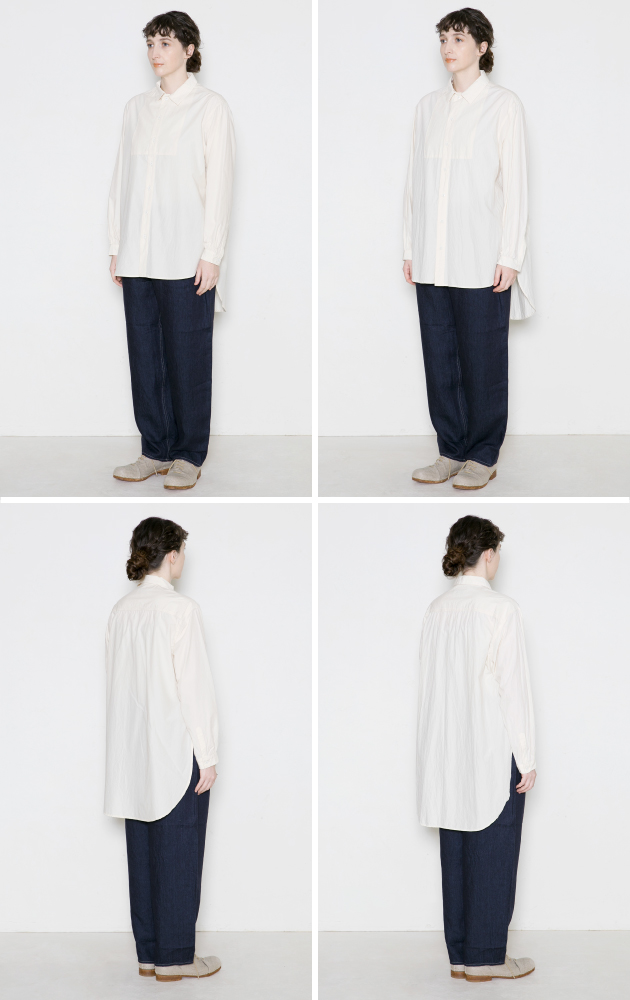 まるでツバメの尻尾のような“スワローテール”が特徴的なシャツ。こちらはオーガニックコットンとコットンヘンプの混紡糸を高密度に織り上げた生地を採用しています。サラっとしたシルキータッチな風合いで、ヒップまで隠れるデザインがスタイリングの幅を広げてくれます。サイズ2は1と比べると袖丈や着丈がやや長く、身幅も少しゆったり着用いただけるサイズ感になっています。