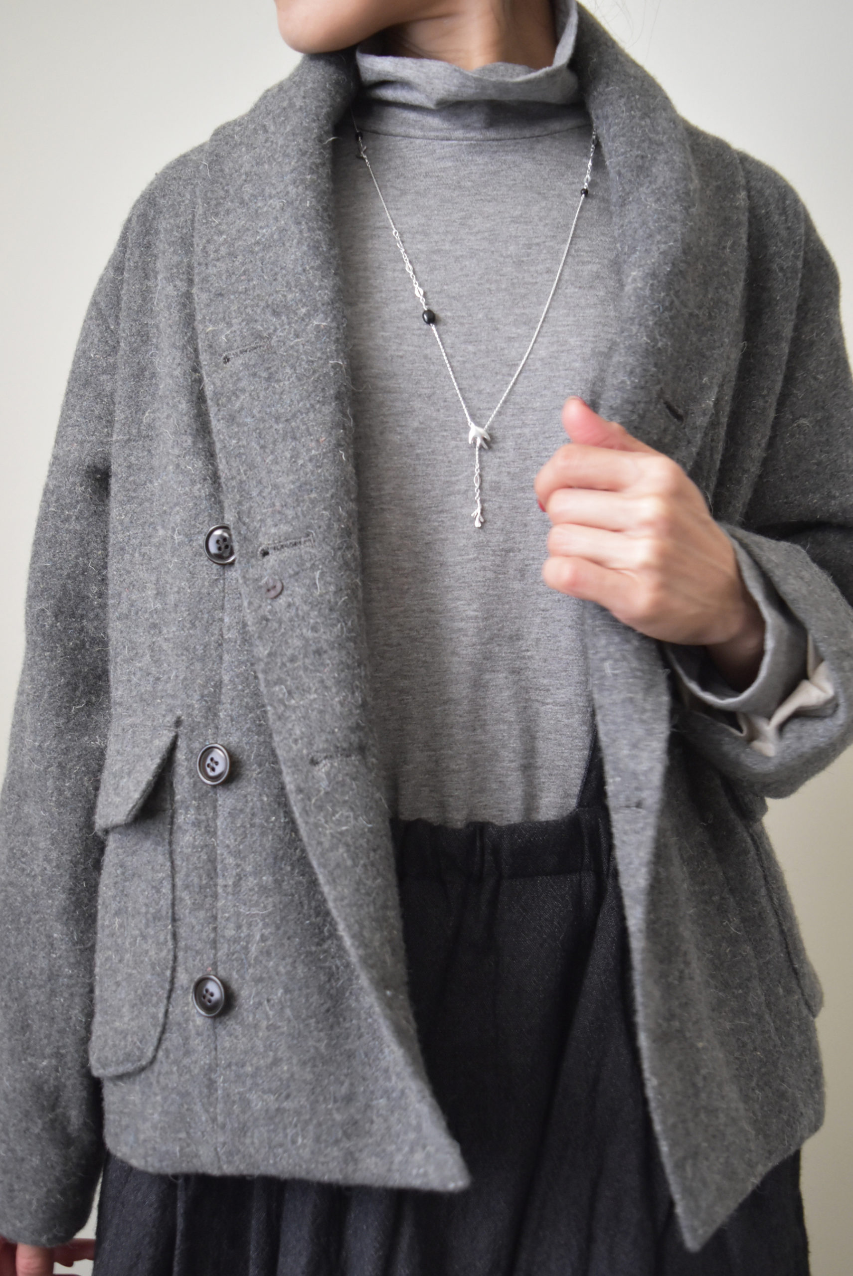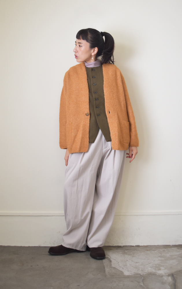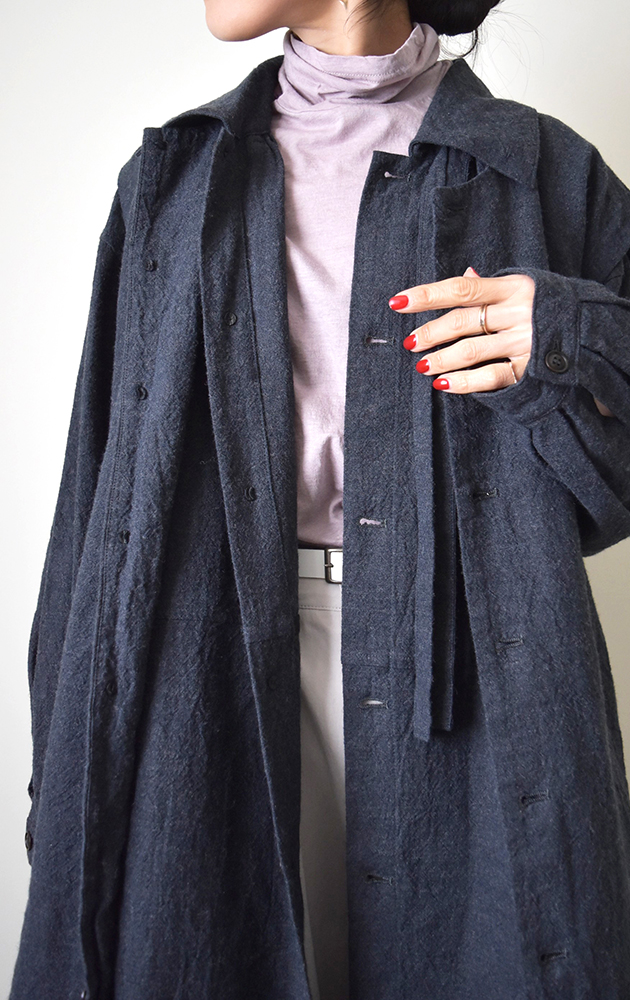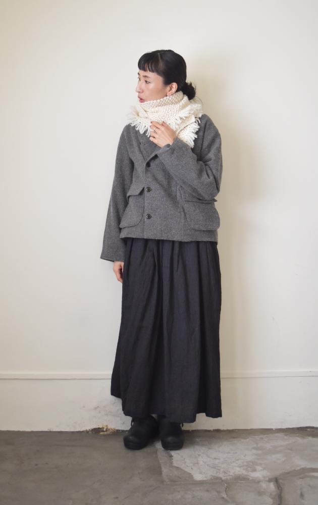 今年の冬はまったりゆっくり過ごしたいという方、日々の疲れを癒してくれる温泉巡りの旅はいかがでしょうか。新作のラミーウールを使用したジレは、羽織るだけでスタイリッシュに魅せてくれるので、旅館で過ごす際、室内着だけではちょっと心細い、なんて時に活躍してくれるアイテムです。同素材のコートとのレイヤードもおすすめで、どちらを上に重ねても様になるアンサンブル仕様になっています。温度調節がしやすく、アレンジも自由自在なコートとジレで、気兼ねなく温泉旅行をお楽しみください。