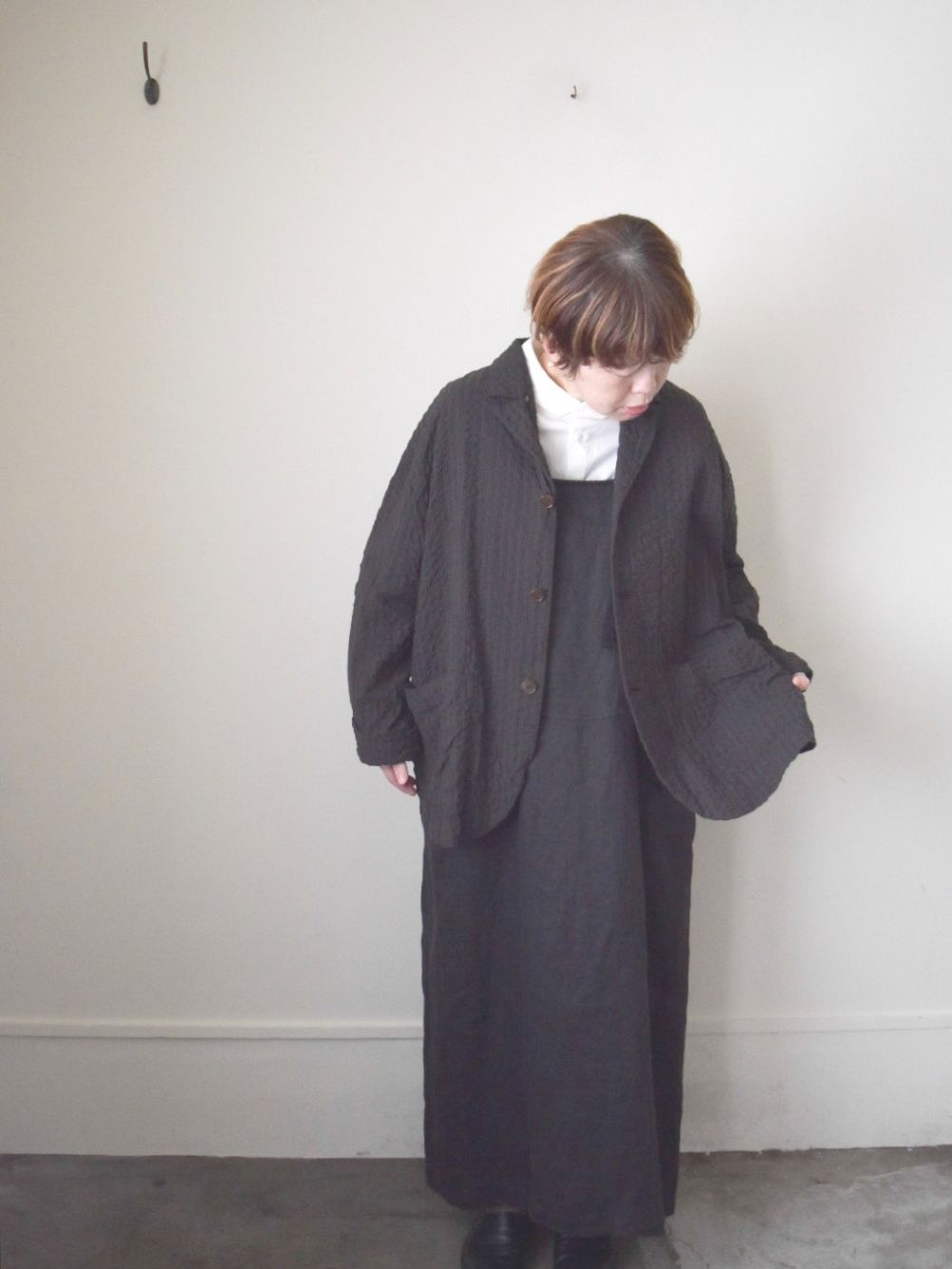 その実、近づいてみるとふっくらとしたジレの生地感で柔らかな印象になる、遠くと近くで二つの印象となる楽しい組み合わせです。