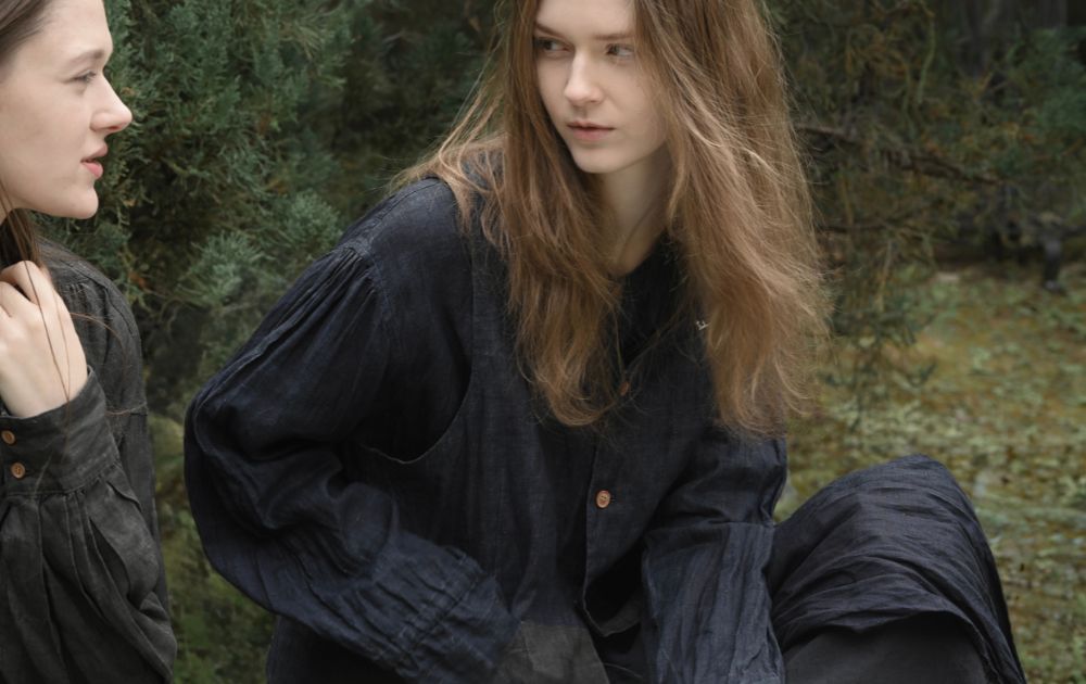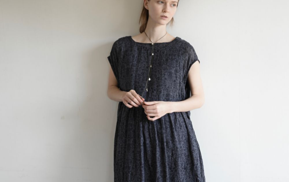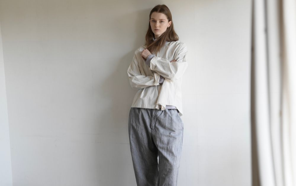 独特な素材感が魅力的な『Indigo/SUMI Coating Linen』シリーズ。リネン生地にインディゴ/墨のプリントを施し、そのあと洗いをかけることで、ヴィンテージファブリックのようなシワ感と、長年愛用しているような自然なフェード感を表現できました。一見厚みがあるように思われますが、手に取ってみるときっと軽さに驚かれるかと思います。薄手だけど透けにくく、シワさえもデザインの一部として成り立っています。