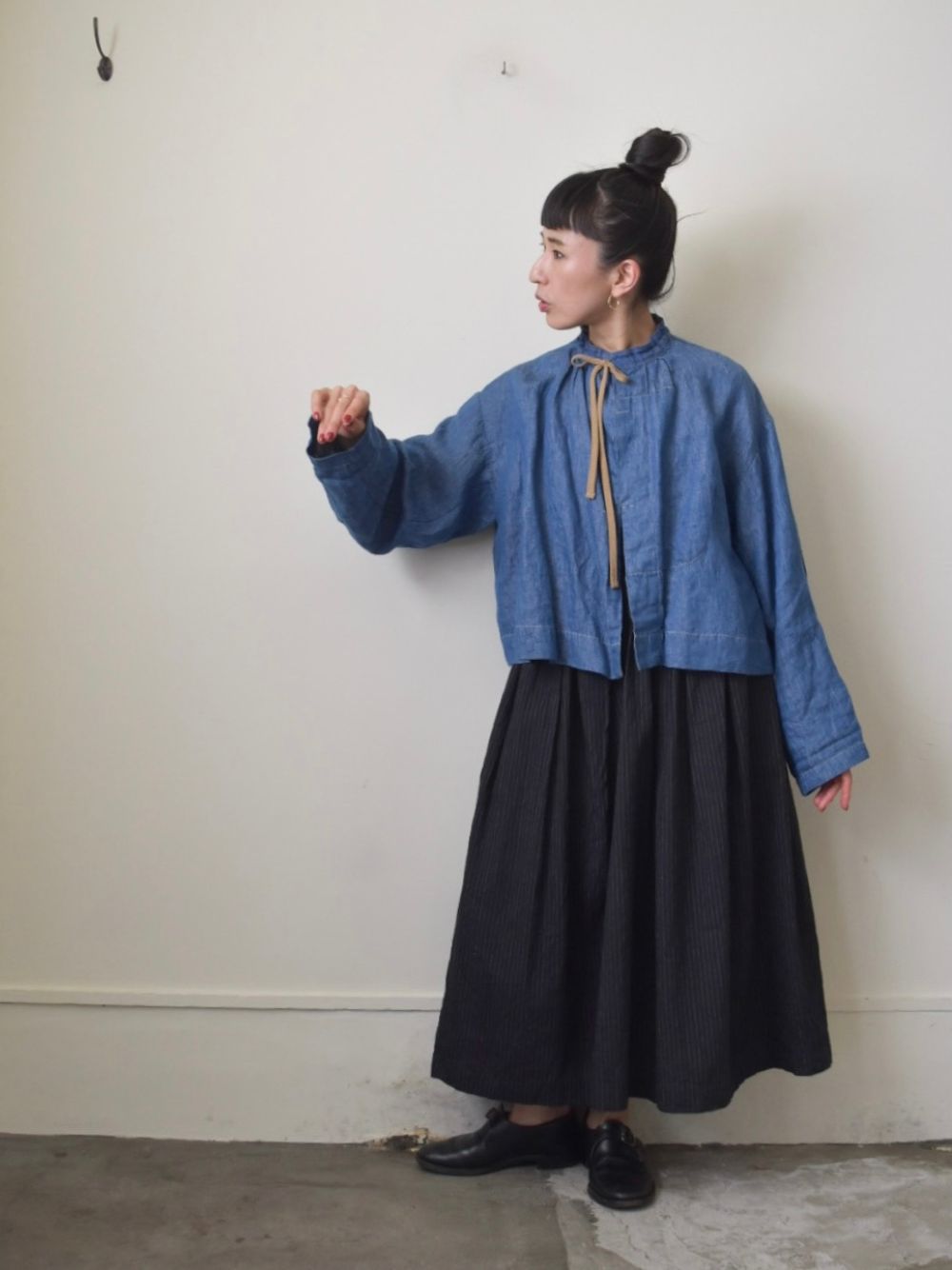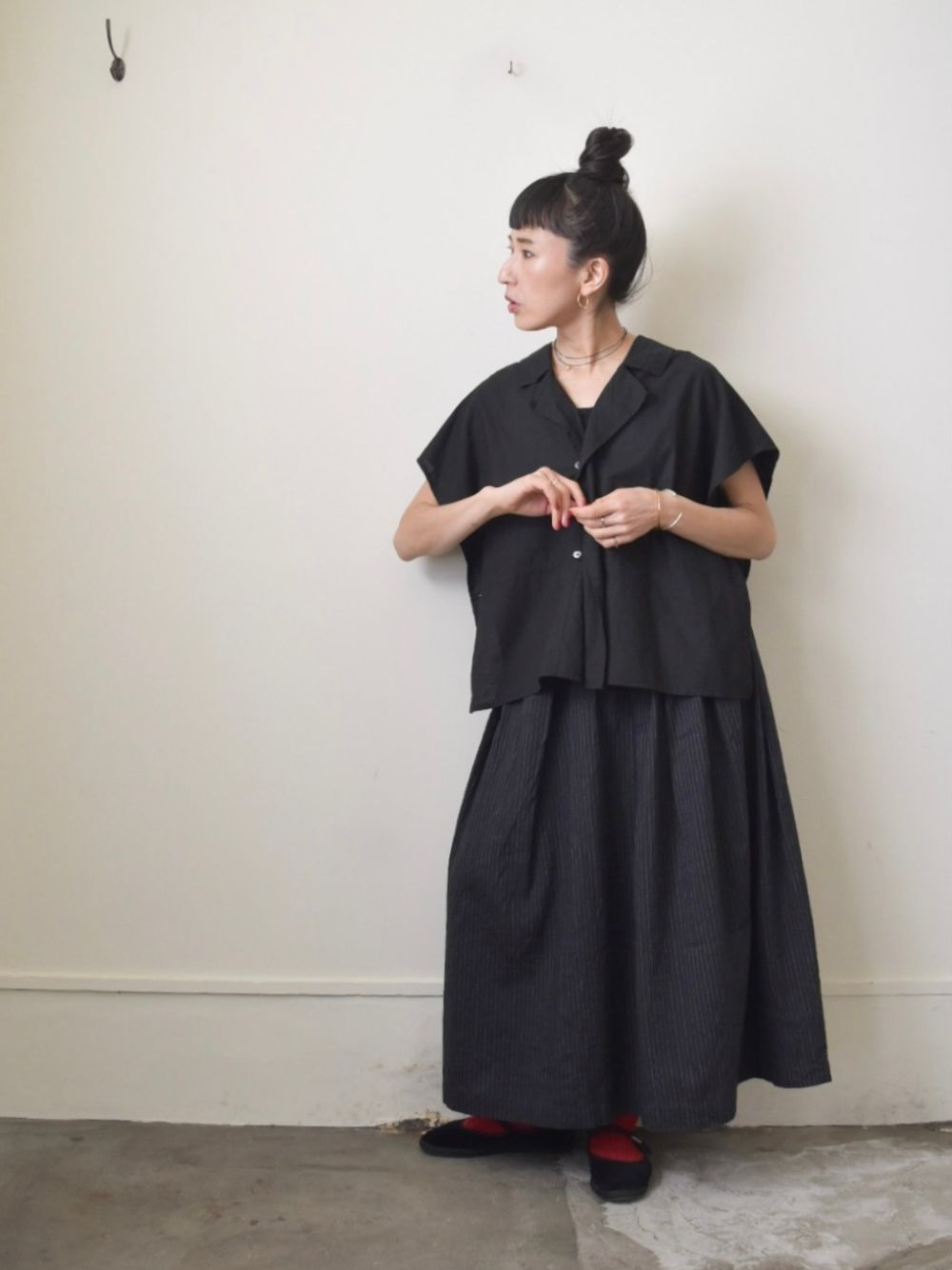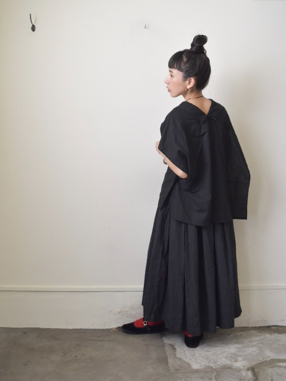 スカートは、生地の柔らかさとギャザーの分量がぴったりマッチして絶妙な動きと程よいボリュームにひろがったり落ち着いたり。この生地の特徴を最大限に生かせるギャザー分量でお作り出来たとスタッフ一同ほくほくうれしくなっております。