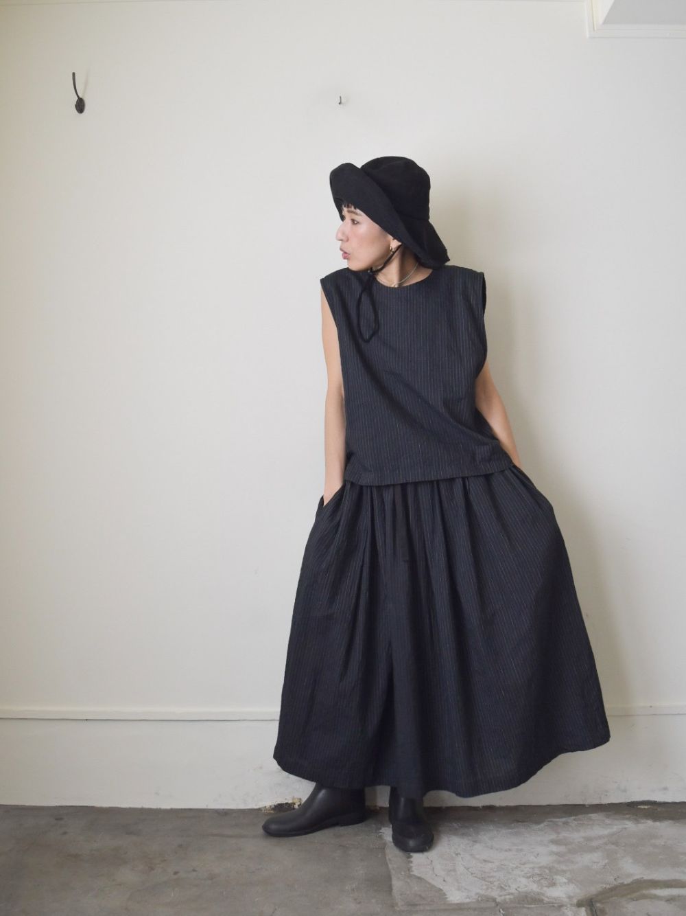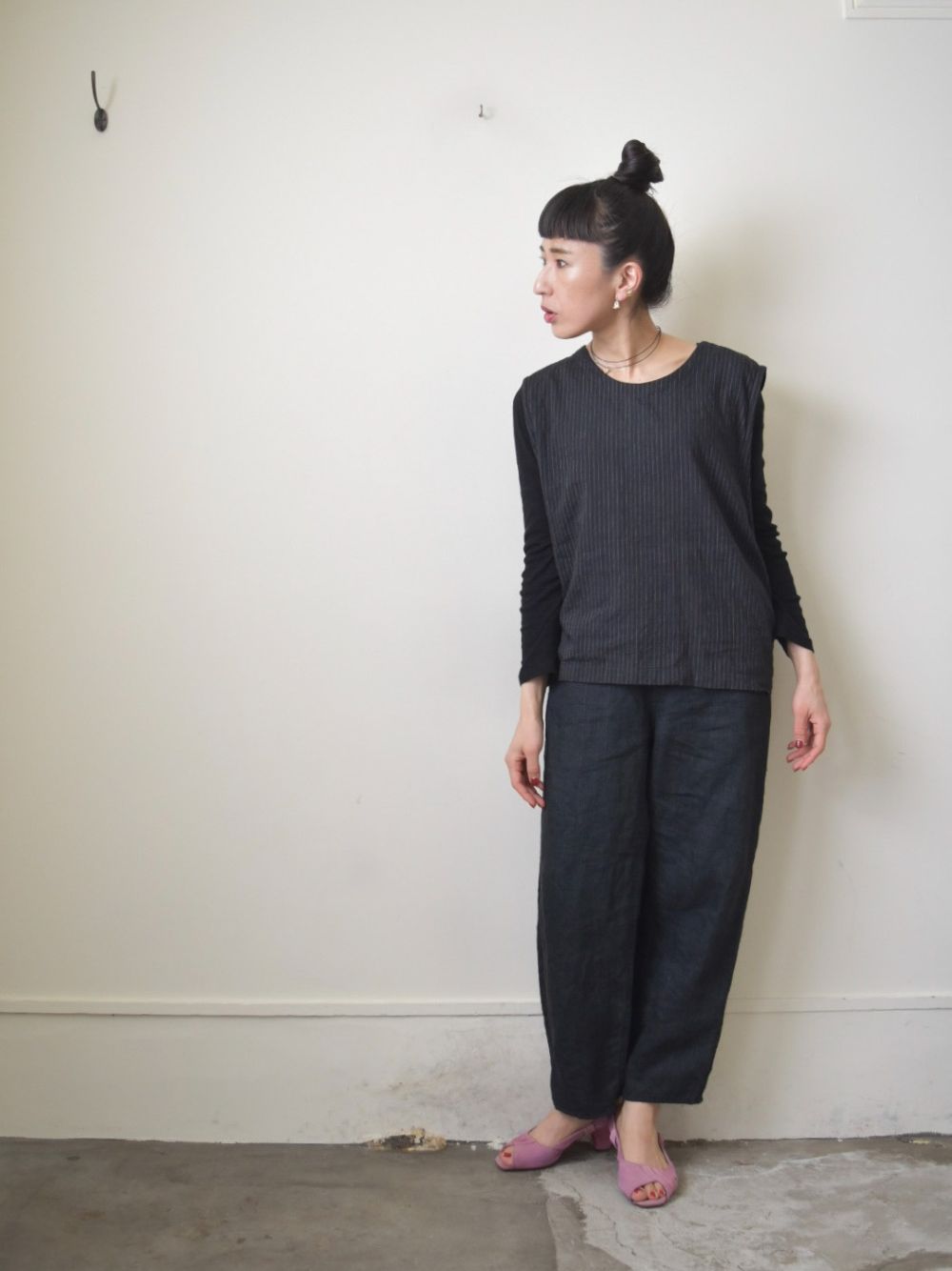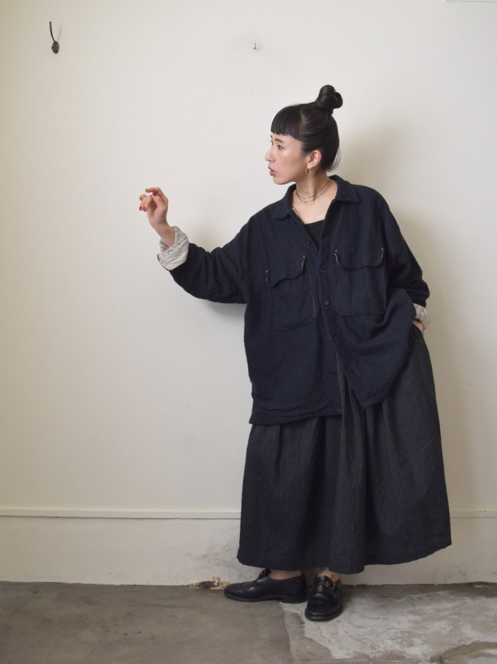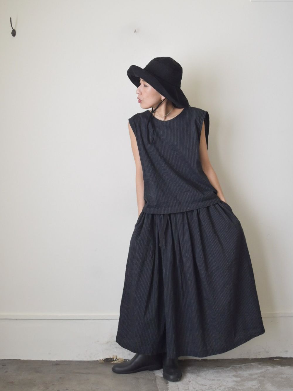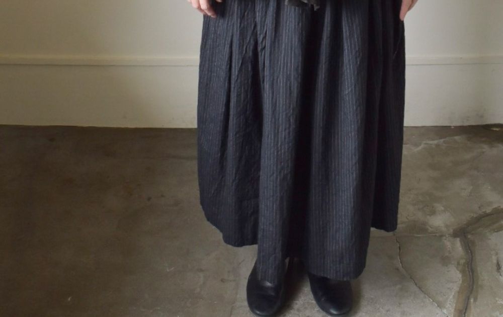 細くこまかだけれどしっかりとアクセントとなるストライプと、柔らかなコットンリネン地の組合せを皆さまにお伝えすべく今回このアイテムをピックアップさせていただきました。